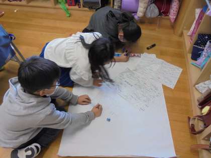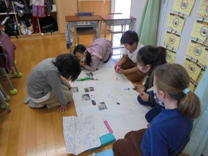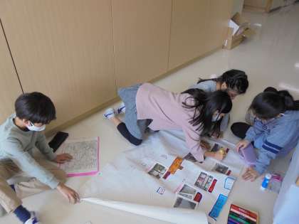 30日(月)の3時間目、3年1組は総合の時間でした。グループごとに「安全マップ」の作成をしていました。自分たちの歩いたところの地図を描いたり、撮った写真を貼ったりしています。完成が楽しみです。