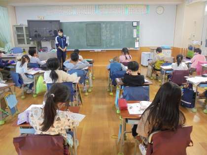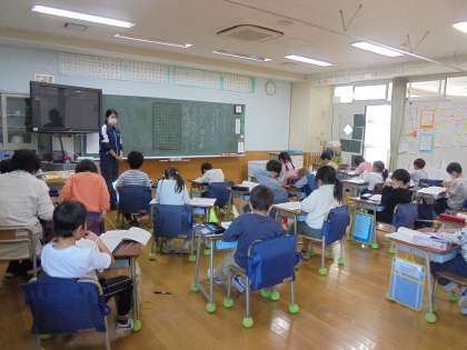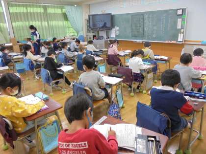 30日(月)の5時間目、1年1組は国語の時間でした。漢字のもととなる絵をヒントに、漢字に直して文章を完成させていました。「横棒の上に丸一つ」の絵は「上」を、「たき火」の絵は「火」を表しているなど、一つ一つの絵から漢字を見つけることができました。