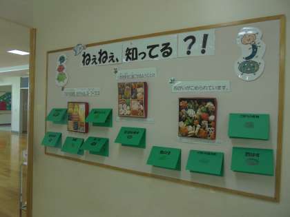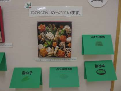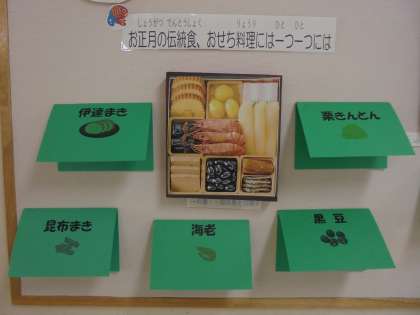 2階1年2組の前の壁面に「ねえねえ知ってる?!」と題した食育コーナーが誕生しました。栄養士が担当して作っています。今回のテーマは、「おせち料理」。それぞれの料理に込められた願いを紹介しています。初めて見た子どもたちは、「これ知ってるよ。」「おいしそう。」と話していました。