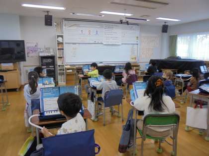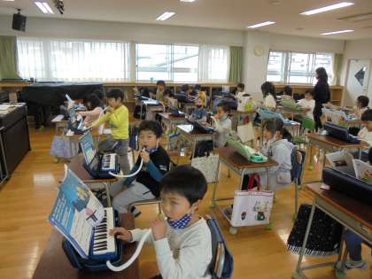 3日(木)の4時間目、1年1組は音楽の時間でした。今月の歌の練習をしてから、鍵盤ハーモニカを出しました。教科書にある「きらきらぼし」の練習をしました。
