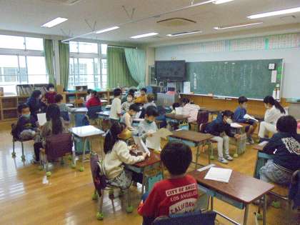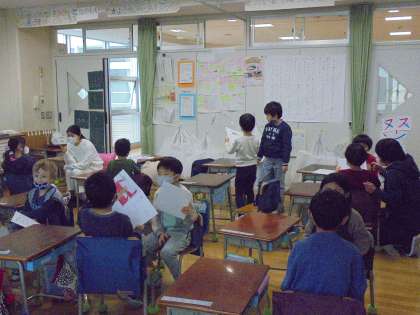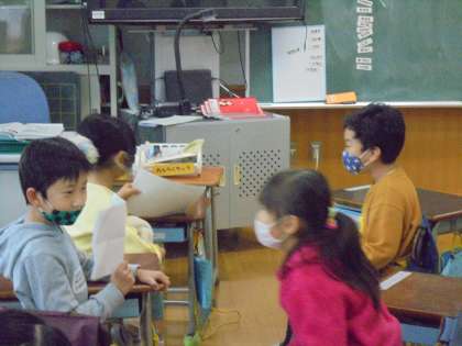 5日(土)の4時間目、1年1組は教科「日本語」の時間でした。「作ったなぞなぞをともだちにだそう」と題して、ペアの子となぞなぞを出し合う内容でした。自分の作ったなぞなぞを出し、相手の答えを聞いてから、正解とその理由を伝えます。窓側の列の子が席を移動し、新たなペアでなぞなぞをしました。友達とのやりとりがとても微笑ましかったです。