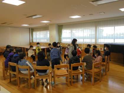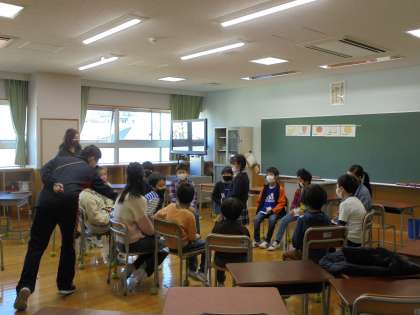8日(火)の朝、たてわり班の教室に移動して、サークル対話をしました。今回は、対話と言うよりも「英語でゲーム」をしました。子どもたちがよく知っている「フルーツバスケット」、そのフルーツをすべて英語で発音してコミュニケーションをはかろうとしています。フルーツは全部で5種類です。「もも」ではなく、「ピーチ」と発音してゲームを楽しんでいました。