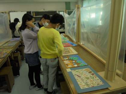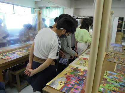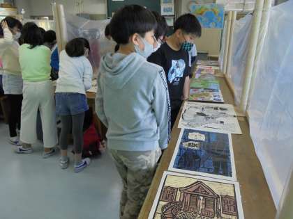 8日(火)の3時間目、5年1組は図画工作の時間でした。今回は、「形と色でコミュニケーション」と題して、海外の同世代の子どもたちの作品を鑑賞しました。何に描いたのか、何で描いたのか、何を描いたのかを考えながら見て歩きました。