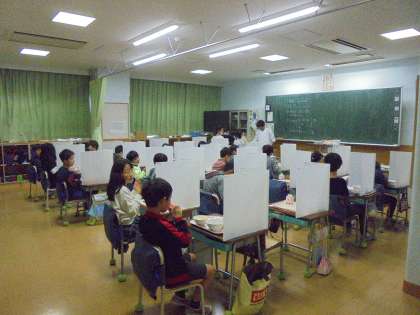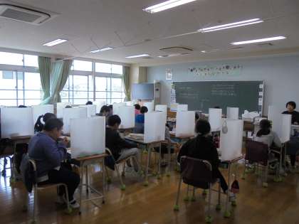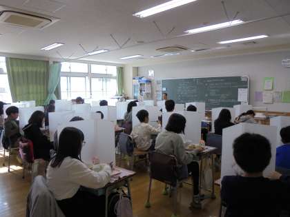 11日(金)の給食の様子です。1週間最後の給食には、調理員さん手作りの「ジャンボしゅうまい」が登場しました。その大きさに子どもたちも驚いていました。写真は上から、5年1組、4年2組、2年2組の様子です。