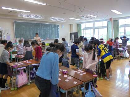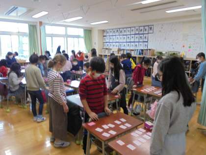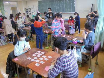 12日(土)の3時間目、3年1組は教科「日本語」の時間でした。グループを作って、「五色百人一首」に取り組んでいました。読み手は、担任の先生です。立っても座ってもよいルールで始まりました。札を取った時は、「やったあ」と喜んでいました。
