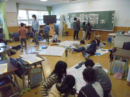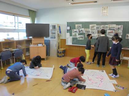 15日(火)の2時間目、2年2組は生活科の時間でした。先週出かけた「まちたんけん」のことをグループごとにまとめていました。床に地図が印刷された紙を広げたり、黒板に張り出された写真を眺めたりしながら協力して進めていました。