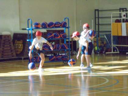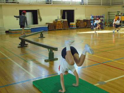 17日(木)の2時間目、2年1組は体育の時間でした。体育館内に、マット、平均台、ボール、跳び箱が並び、「スポーツランド」が登場しました。各場所にはミッションがあり、それをクリアしながら何周もまわりました。