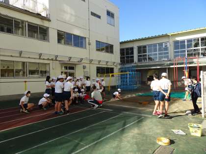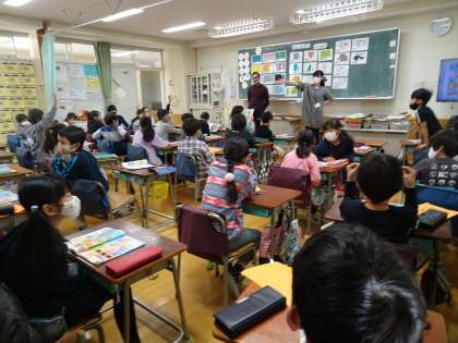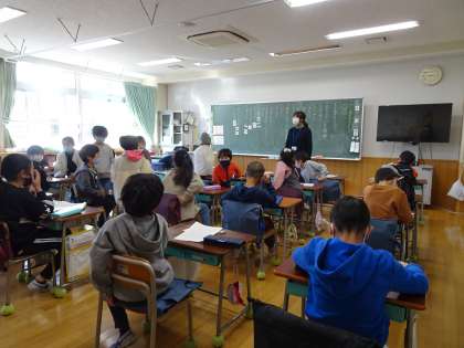 18日(金)の1時間目の様子です。中校庭の砂場では、5年1組が走り幅跳びに取り組んでいました。3年1組は外国語活動の時間でした。子どもたちは、色やものの名前を英語で発音できるようになっています。2年1組は学級活動の時間で、お楽しみの計画をを話し合っていました。