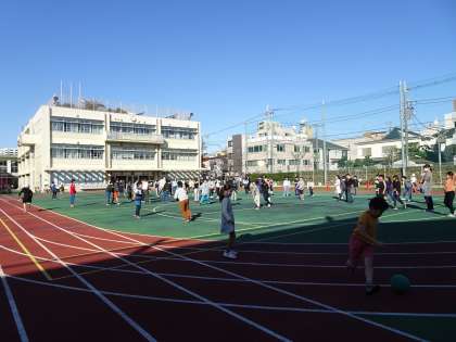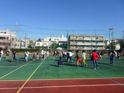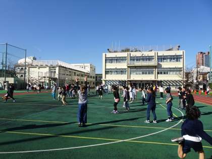 18日(金)の中休みの様子です。青空のもと、クラス遊びをする学級がいくつもありました。担任の先生も加わり、楽しく遊んでいました、」