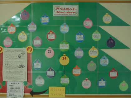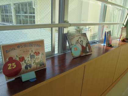 図書室では、「アドベントカレンダー」に取り組んでいます。階段の壁面に大きなクリスマスツリーを飾り、カレンダーにもしています。日によって紹介される本が変わります。冬休み前の図書貸し出しが始まったことから、紹介した本を廊下の窓辺に展示することにしました。子どもたちにぜひ手に取ってほしいです。