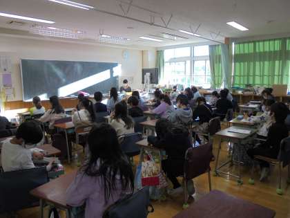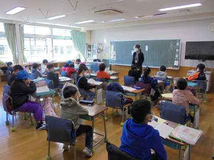 21日(月)、2学期最後の放送朝会でした。最初は校長先生の話です。話の前半は、先週取り組んだ「ありがとうの花束」から、6年生の言葉を紹介しました。各学級では、しっかりと聞く姿がありました。写真2枚目から、3年1組、2年1組の様子です。