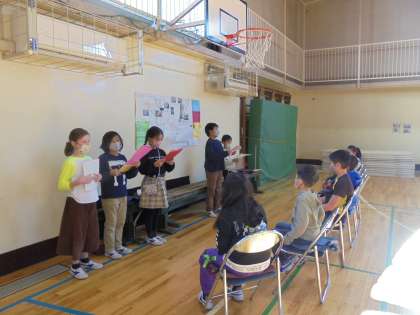 21日(月)の5時間目、3年生が2年生を招待して「安全マップ発表会」を行いました。体育館の壁を利用して、広く場所を取り、2年生はパイプいすに座って話を聞きました。