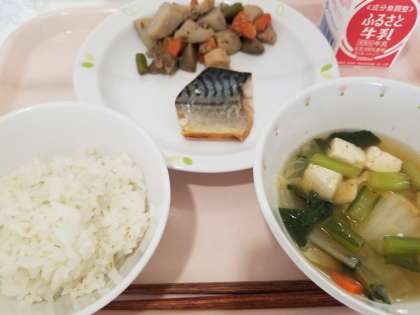 ごはんに野菜たっぷりの汁物、そして主菜のお魚に煮物。