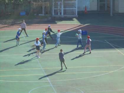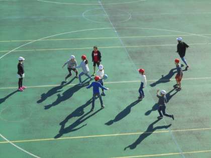 23日(水)の2時間目、4年2組は体育の時間でした。校庭で「ゴール型ゲーム」に取り組んでいました。ルールを簡単にして、パスをつなぎながら得点を取りにいきました。