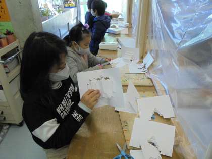 23日(水)の2時間目、2年2組は図画工作の時間でした。カード作りの仕上げをしていました。切り込みを入れてできる模様に魅力を感じ、何枚もカード作りをしている人もいました。終わった人は「粘土」で自由作品に挑戦していました。
