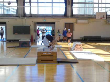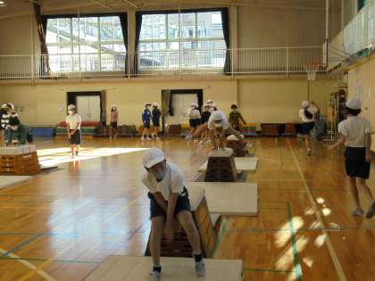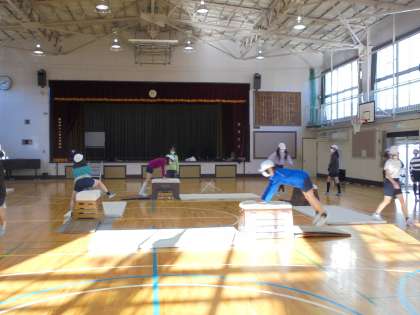23日(水)の5時間目、6年1組は体育の時間でした。跳び箱運動に取り組んでいました。今回は、跳び箱3台を縦に並べる直線コースと4台を四角に配置するスクエアコースを作りました。開脚とびをしたり、台上前転をしたりしながら、技の定着を図りました。