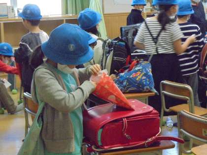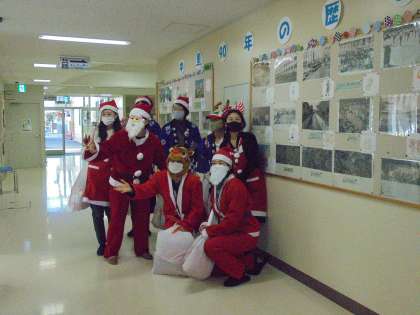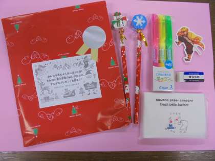 サンタクロースは、鈴を鳴らしながら移動し、クラスごとに大きな袋を届けてくれました。担任が受け取りましたが、子どもたちは大喜びでした。納涼子ども祭り実行委員の皆様のおかげで、子どもたちにすてきな思い出を残してあげることができました。また、お忙しい中、物品の購入や袋詰め等の作業もしてくださいました。心より感謝申し上げます。