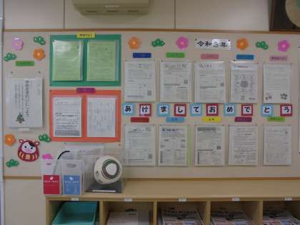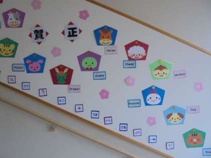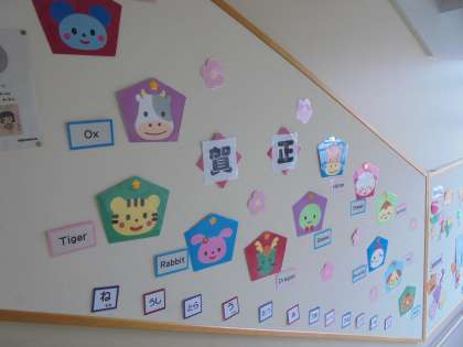 職員室前や夕焼け階段の壁が新年用に変わりました。事務アシスタントの手によるものです。職員室前は梅や松の飾りを中心に、夕焼け階段は十二支を絵と英単語で表しています。