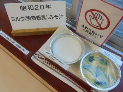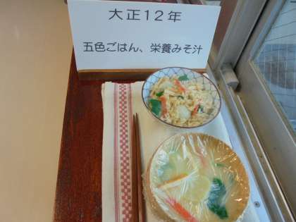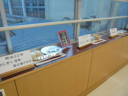 ランチルーム前の出窓に、給食のレプリカが並びました。毎年、1月24日から30日までを「全国学校給食週間」としており、今回は、栄養士が各年代の給食を展示しました。明治22年当時の給食から始まり、大正12年当時、昭和20年当時の給食へと続いています。