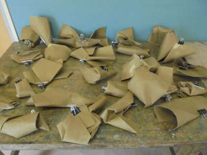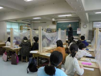 12日(火)の3・4時間目、5年1組は図画工作の時間でした。「紙の特徴を生かして」と題して前半は段ボール紙を、後半を和紙を使って取り組みました。段ボールを湿らせて、自由に形をつくったり、和紙を蛇腹折りにしてから小さな三角形に折ったりしました。