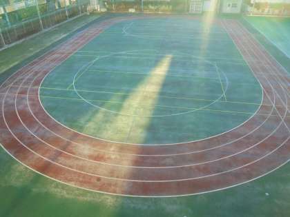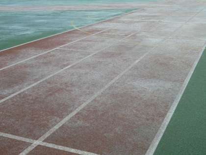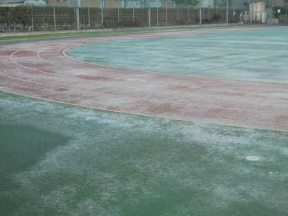 13日(水)の朝、ゴム張りの校庭に霜が降りていました。それだけ気温が低いということです。写真は午前7時の様子です。「子どもたちが転ばないように声をかけよう。」と先生たちが話をしていました。