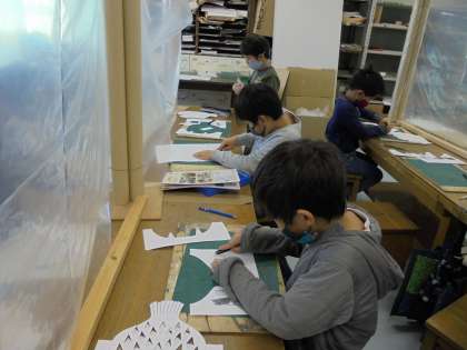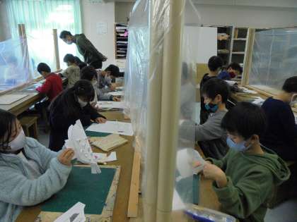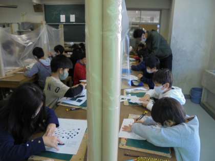 13日(水)の1・2時間目、2年2組は図画工作の時間でした。「カッターを使って」と題して、魚の鱗やひれにカッターで切込みを入れました。先生から使い方の説明を聞いて、慎重にカッターを操作していました。