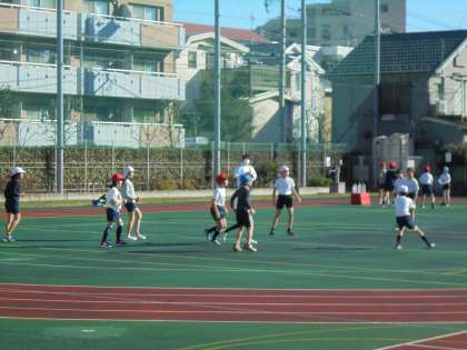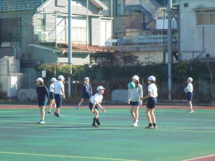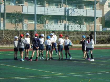 13日(水)の2時間目、4年2組は体育の時間でした。校庭でゴール型ゲームに取り組んでいました。水の入ったペットボトルにボールを当てるために、味方同士でパスをつないでいました。チームごとに作戦を立てて臨んでいました。