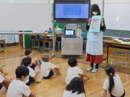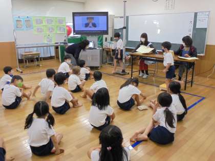 14日(木)の1時間目、1年1組は発育測定を行いました。1組だけは時間割の都合上、今回実施しました。養護教諭による話のテーマは、「手洗い」でした。手の洗い方を歌付きの映像を見ながら練習しました。