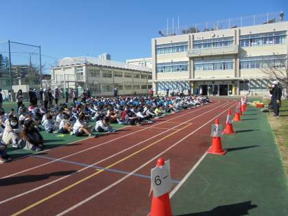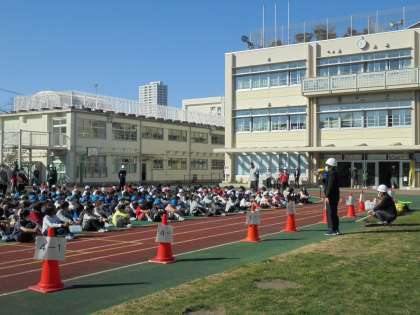14日(木)の中休み、避難訓練を実施しました。今回は、休み時間に地震が発生したと想定しています。多くの子どもたちが外遊びをしていたこともあり、集合は2分少々でできました。「自分の身は自分で守ること」と校長先生の話にありました。