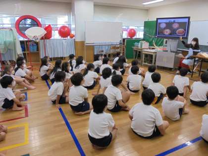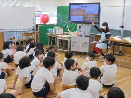 14日(木)の3時間目、3年1組は発育測定を行いました。養護教諭による話のテーマは、「歯」でした。3択クイズを織り込みながら、むし歯や歯肉炎にも触れました。