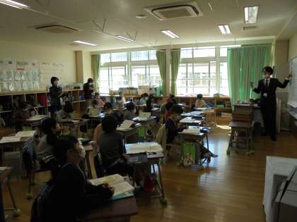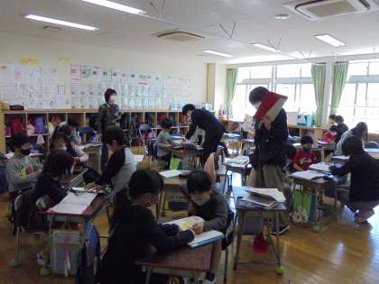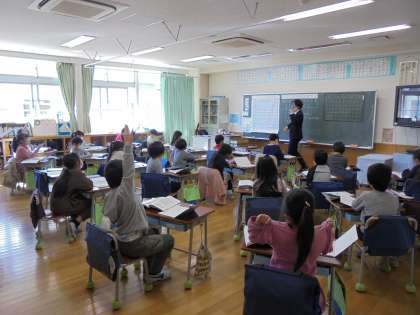 19日(火)の3時間目、1年2組は算数の時間でした。今回は、数字の並びのきまりについて考えました。担任の先生が示した100までの数を見ながら、「横に1増える」「縦に10増える」などきまりを見付けていました。最後は、友達と数字当てクイズをしました。数字並びのきまりを使って、次々に正解していました。