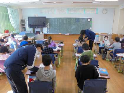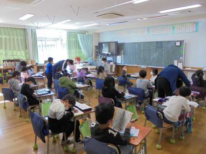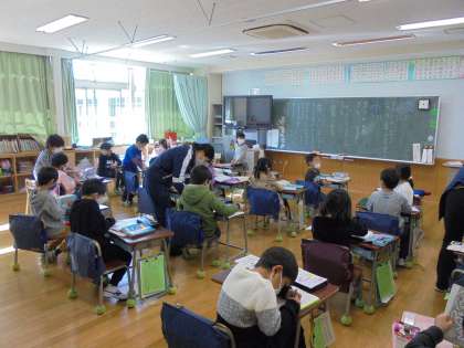 20日(水)の4時間目、1年1組は国語の時間でした。最初に新しい漢字を学習しました。「口」と「年」の2文字です。次に、「おもちや」と「おもちゃ」の言葉の違いについて考え、自分でもことば探しをしました。