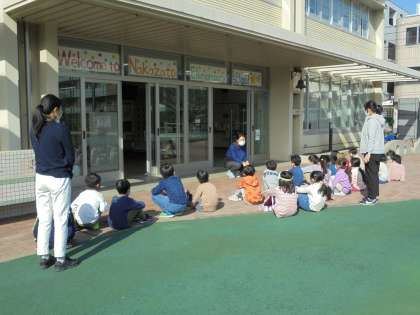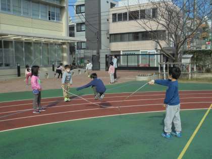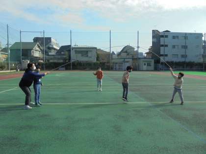 21日(木)の4時間目、1年1組は音楽の時間でした。後半は活動場所を音楽室から校庭にかえました。「おおなみこなみ」の歌に合わせながら、実際に長なわで遊びました。繰り返すうちに、歌に合わせてとべるようになりました。