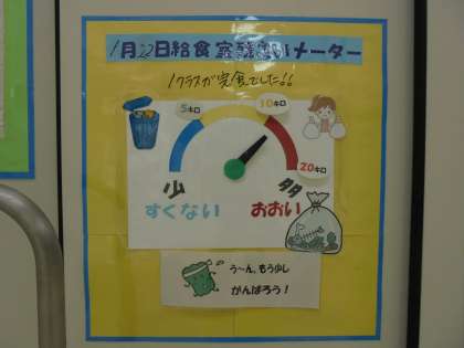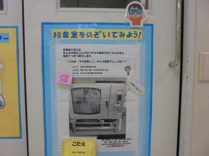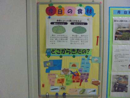 給食室前には、残菜メーターの他にも、「今日の食材」や「給食室をのぞいてみよう」のコーナーがあります。残菜メーターは、22日(金)の結果が出ていました。「豆腐チゲ」の残りが多かったとのことです。クラス全体で完食しているところもあるので、栄養士も「改善していきます。」と張り切っていました。食材紹介は「キャベツ」を取り上げています。