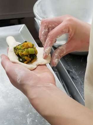 おやきは生地から手作り。中の具は、野沢菜漬