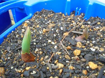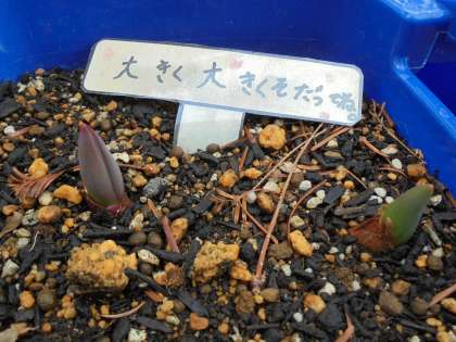 1年生が育てているチューリップの球根の続報です。1月に観察したときよりも芽が伸びてきました。子どもたちは水やりをしながら、観察を続けています。