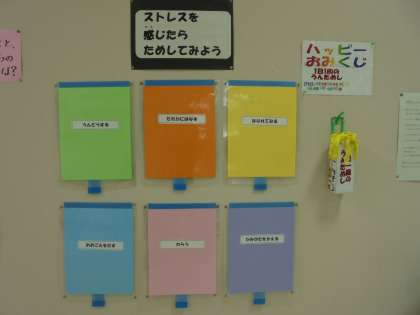 2月に入り、保健室前の掲示物が新しくなりました。今回のテーマは「ストレス」です。「こころマンション」の各部屋にそれぞれの気持ちが書かれています。子どもたちに人気の「ハッピーおみくじ」は2月も継続します。
