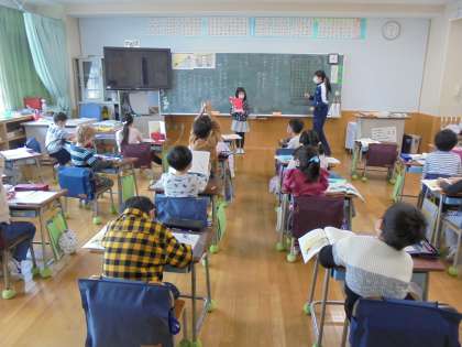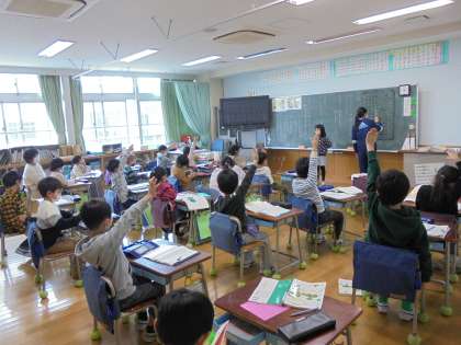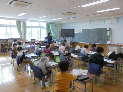 2月1日(月)の5時間目、1年1組は国語の時間でした。物語「たぬきの糸車」を読んでいます。今回は、「たぬきのしたことや気持ち」を想像しました。ノートに考えを書いたり、手を挙げて発表したりしました。
