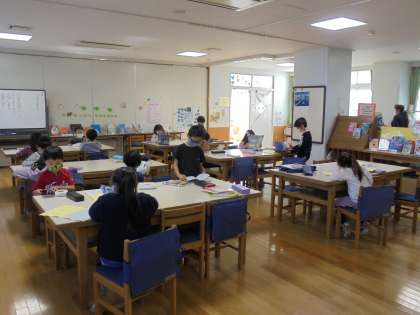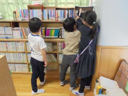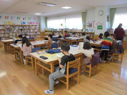 2日(火)の5時間目、1年2組は図書の時間でした。前回借りた本を返してから、読みたい本を探し、自分の席で静かに読む姿がありました。本棚の前では、じっくり本を探す姿や「これおもしろいよ。」と小声で教える姿が見られました。