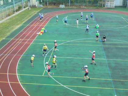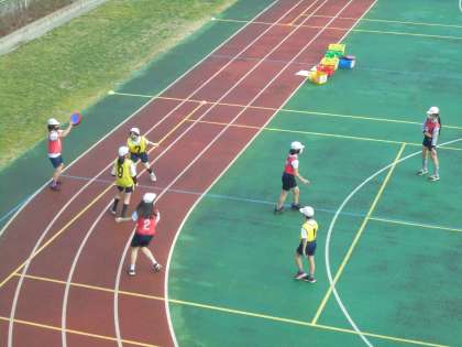 2日(火)の5時間目、6年1組は体育の時間でした。校庭で「アルティメット」のゲームに取り組んでいました。声を掛け合い、喜び合ったり、励まし合ったりしていました。