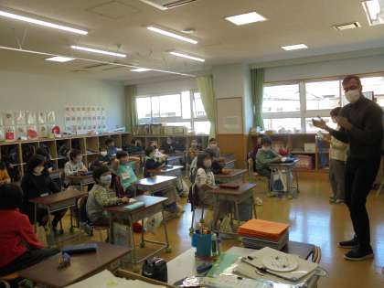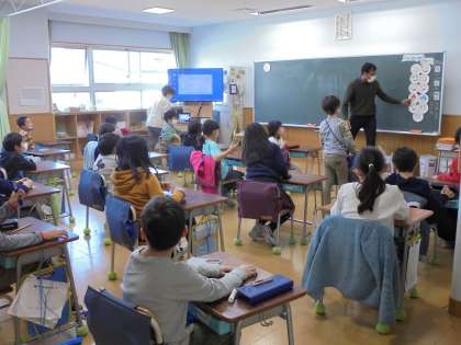 3日(水)の2時間目、2年2組は外国語活動の時間でした。担任の先生とALTとで進めています。振り付きで英語の歌を歌ったり、果物屋さんとお客さんをしたりして楽しみました。