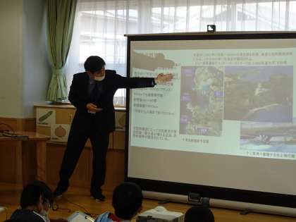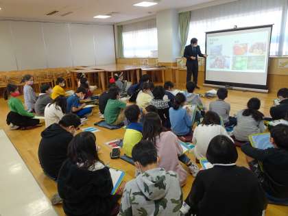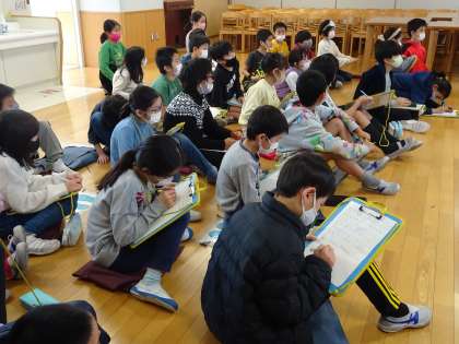 4年生は、事務主事の示す写真や表を見ながら話を聞いていました。特に、内地から物資が届くのに1週間ほどかかることや、重病・重傷者が出た時の救急医療体制を整備するために滑走路が作られたことなどの事実を知りました。子どもたちは、小笠原で暮らす方たちが、島内で助け合って生活していることがわかりました。