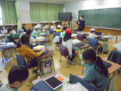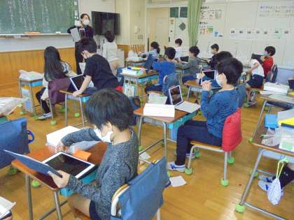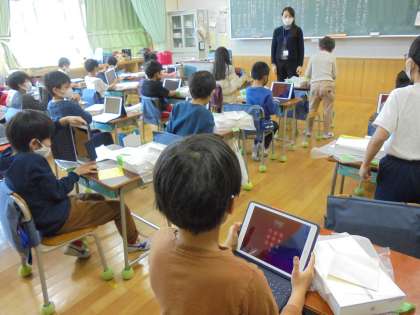 5日(金)の3・4時間目、2年生は各教室で学習用タブレット型端末を配布しました。箱を手にして大喜び、ケースをあけても大喜び、画面が見えても大喜びの子どもたちでした。ネットワーク環境が整うまで、ルーターを数台ずつ使いながら取り組んでいます。本校では、2月8日、9日、10日の3日間、校内通信ネットワークの再整備作業やインターネット工事が行われます。世田谷区では急ピッチで工事等が進められています。