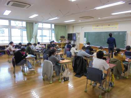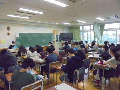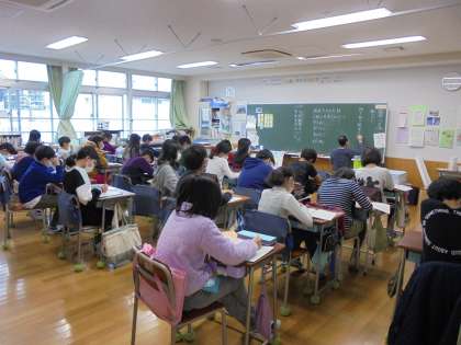 8日(月)の放送朝会の様子です。写真は上から、4年1組、5年1組、6年1組です。9クラスを見てまわると、担任がすわって子どもと一緒に話を聞いているクラス、担任が黒板にテーマの柱を書きながら聞くクラスがあります。どちらでも子どもたちは静かに話を聞いています。