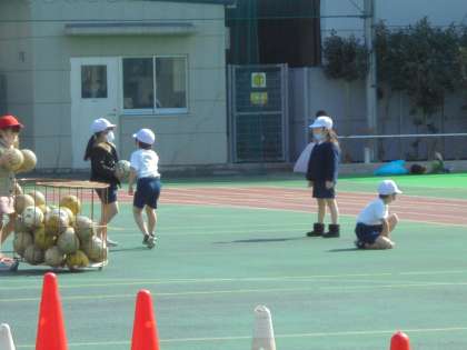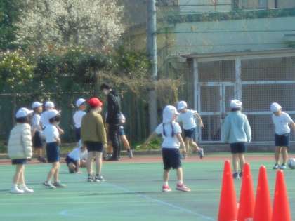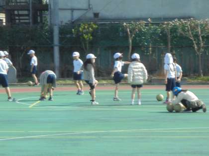 8日(月)の4時間目、1年2組は体育の時間でした。準備運動をしてから3分間走をしました。その後、4人グループを作って、ボール蹴りをしました。