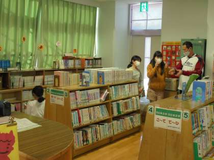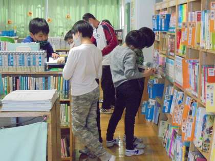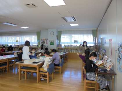 9日(火)の4時間目、5年1組は図書の時間でした。返却が済むと、読みたい本を熱心に探していました。本のことで友達と小声で情報交換をしている姿もありました。