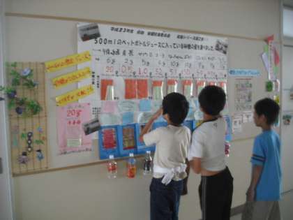 保健給食委員会が、500mlのペットボトルに入っている砂糖の量を調べ、保健室前に掲示しています。「これからは、砂糖の量に気をつけてジュースを選ぼうと思いました」「思ったより糖分が多いなと思いました」などの感想がありました。