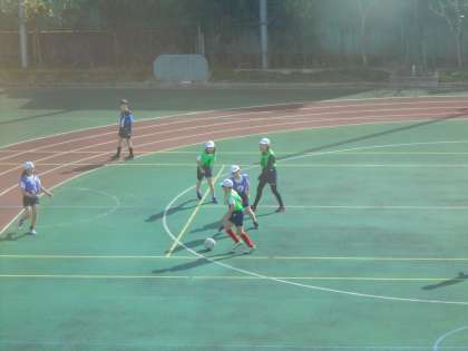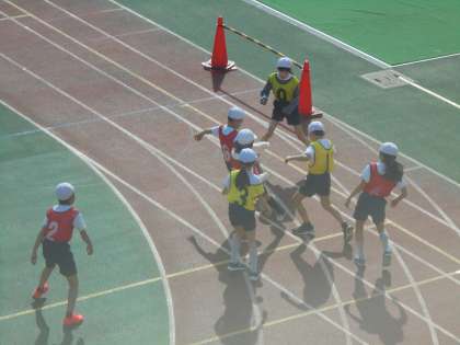 10日(水)の2時間目、4年2組は体育の時間でした。校庭で「ゴール型ゲーム」に取り組んでいました。準備運動のあと、校庭を走ってからゲームに臨みました。足だけでボールを操作しますが、子どもたちはボールの動きをよく見ていました。