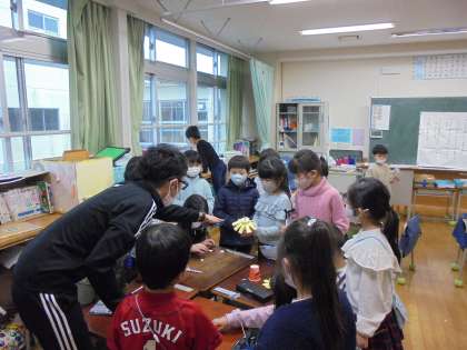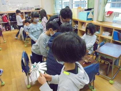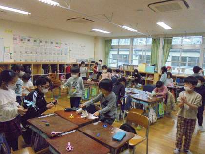 15日(月)の4時間目、1年2組は生活科の時間でした。「かぜとあそぼう」と題して、風車作りをしていました。紙コップに切り込みを入れて、羽を作りました。本日は雨のため、外で試すことができませんでしたが、「早くやってみたい。」と子どもたちは楽しみにしていました。