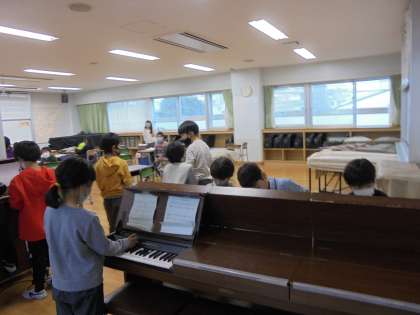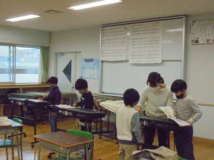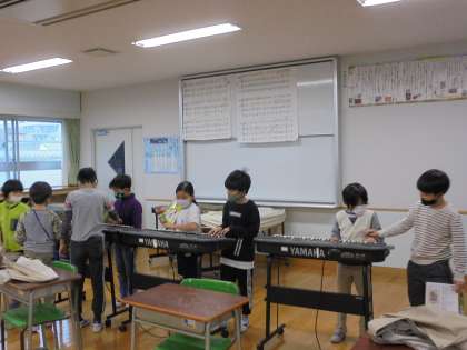 15日(月)の4時間目、2年2組は音楽の時間でした。「こぐまの二月」という曲に取り組んでいます。この題材は、歌声と楽器の音を合わせて演奏することがねらいです。コロナ禍であることから、鍵盤ハーモニカの練習が難しいため、音楽室にある「電子オルガン」を使うことにしました。一人一台はないので、前半と後半に分かれて練習を始めました。